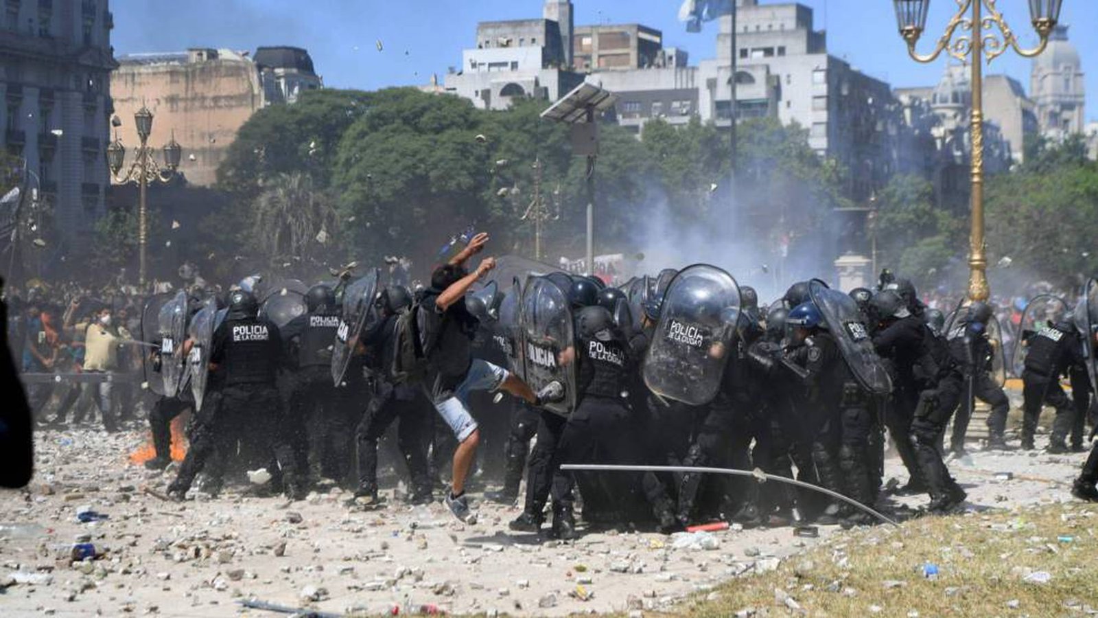 La policía salía detrás de las vallas de a cientos, formando filas y preparándose para sacar a los manifestantes de la plaza. Con carros hidrantes, motos y un sinfín de gases lacrimógenos que caían como lluvia desde el cielo. Mientras las motos atropellaban a los manifestantes, otros policías tirando balas de gomas apuntando a la cara, pegando a ancianos y jubilados, tirando gas pimienta a ancianos indefensos deteniendo y cagando a palos a todo aquel que se les cruzara enfrente.