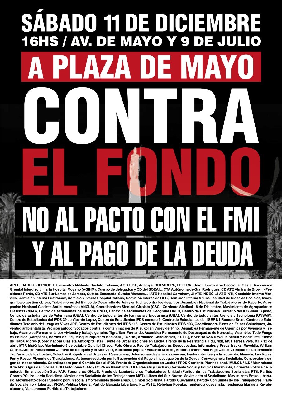 Para derrotar el acuerdo con el Fondo necesitamos pelear en la más amplia unidad, por eso adherimos a la convocatoria impulsada por el FIT-U y tomada por decenas de organizaciones para movilizar el 11 de diciembre. Y decimos que no puede quedar ahí y contentarnos con una movilización. Es necesario dar continuidad intentando sumar a todos y todas los que quieran pelear contra el acuerdo, hayan votado a quien hayan votado. Y en la medida que vaya creciendo empezar a pensar acciones que no solo den testimonio de nuestro rechazo al acuerdo, sino que también afecten la ganancia de los grandes beneficiados con el mismo, los empresarios y las multinacionales.