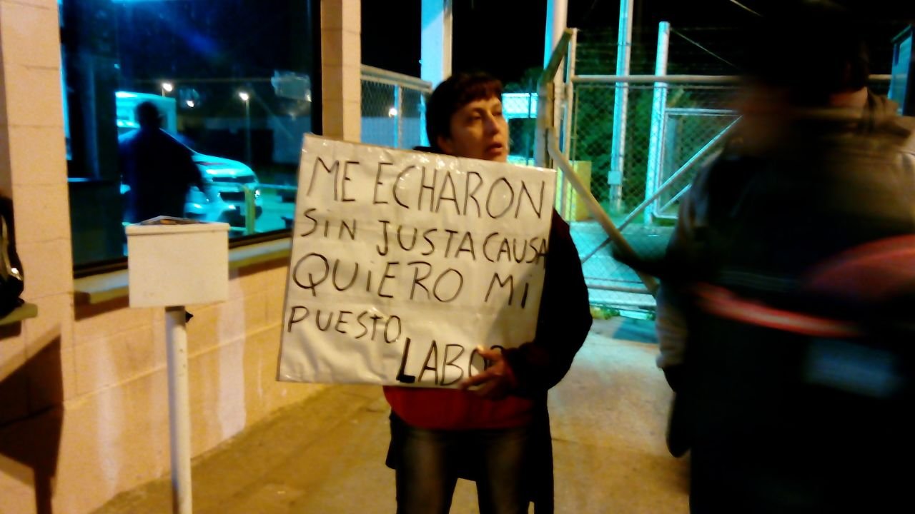 Carina- El jueves 28 llegue a mi casa del trabajo y encontré un papel tirado, era un telegrama diciendo que estoy despedida, aduciendo que tenia 26 faltas injustificadas. Esas faltas son de cuando yo me operé de túnel carpiano, del cual tengo todos los certificados. También decían que hablo con mis compañeros, que soy rebelde que no hago mi trabajo, y que soy una mala imagen, todas mentiras. Por eso reclamé volver a mi puesto de trabajo, hace 11 años que trabajo en la empresa. Estoy a cargo de familia, tengo tres hijos menores, uno especial, quedé viuda hace 3 años, y soy el sustento de mi familia. Gracias a la lucha volví a trabajar